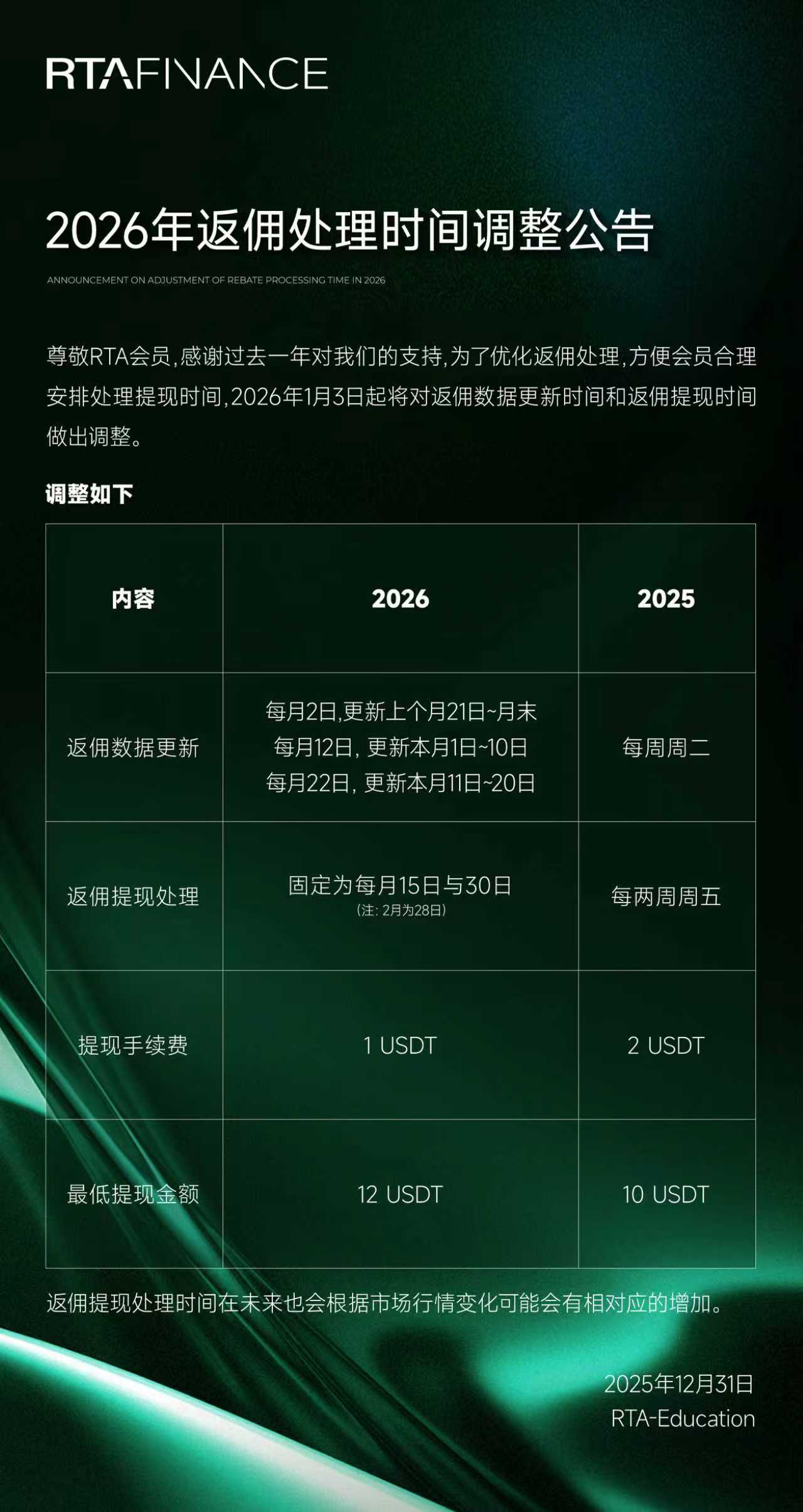2026年返佣处理时间调整公告